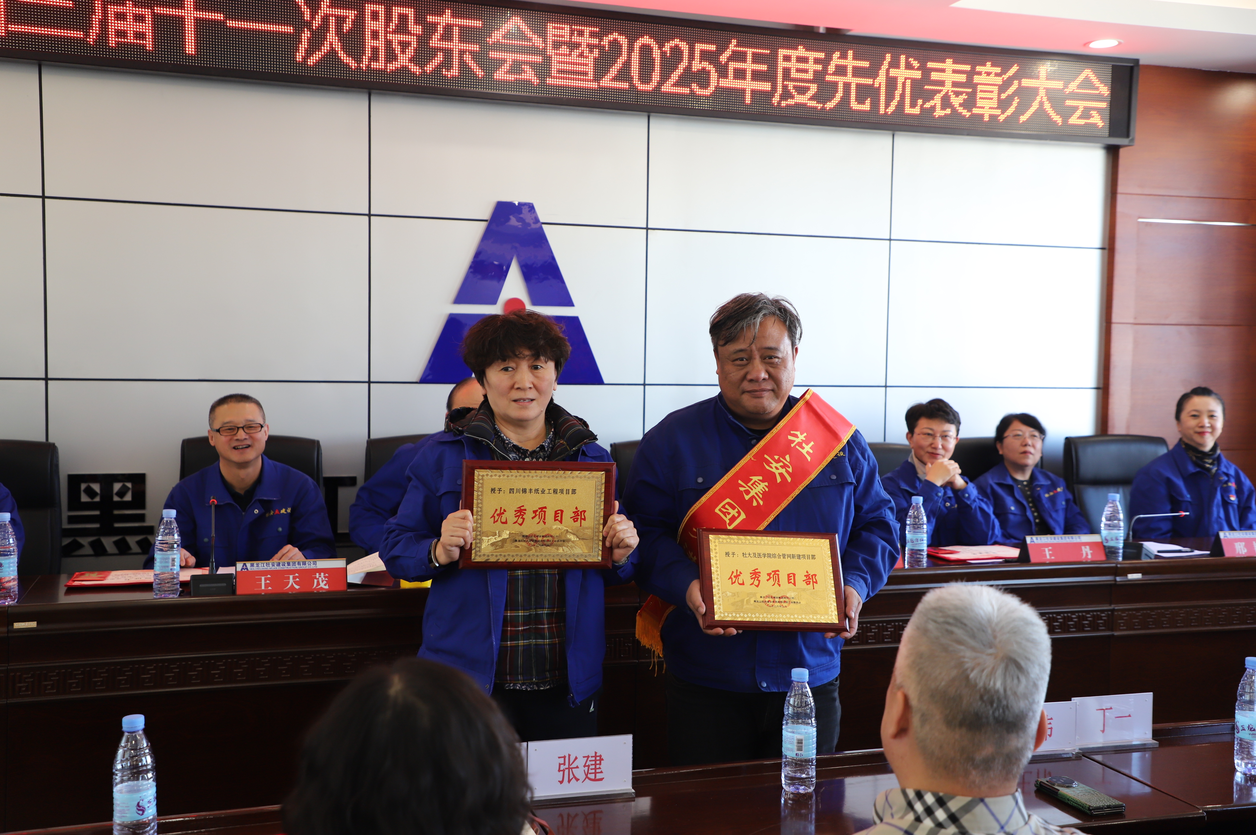 優(yōu)秀項(xiàng)目部獎(jiǎng),左起:四川錦豐紙業(yè)工程項(xiàng)目部、牡大及醫(yī)學(xué)院綜合管網(wǎng)新建項(xiàng)目部